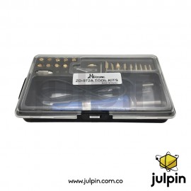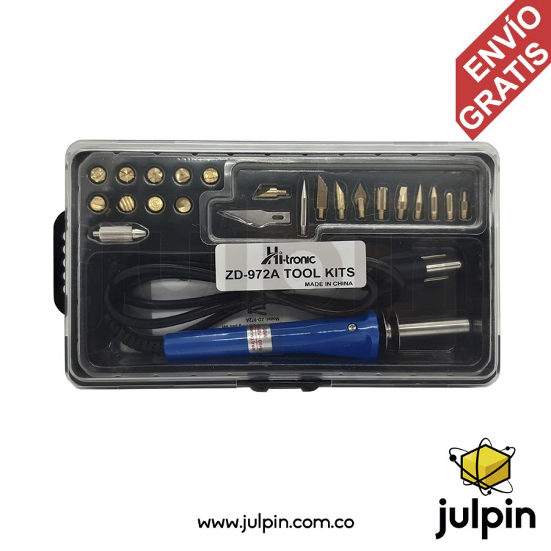 Se trata de un kit de cautín con 21 puntas intercambiables especialmente diseñado para los que son amantes, estudiantes o profesionales del pirograbado . El kit ZD-972A permite grabar en madera, foami, plástico y otros materiales a través del calor generado por el cautín de 30W y las diferentes puntas de bronce con formas y grabados especiales. Las puntas se intercambian roscándolas en la punta del cautín.