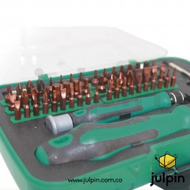 Se trata de un kit de herramienta de destornillador profesional compuesto por un set de 58 piezas que ofrecen múltiples opciones en forma, tamaño, flexibilidad y técnica para realizar trabajos de precisión en diversos equipos de diferentes tamaños, como teléfonos móviles o celulares, juguetería, computadores y equipos electrónicos en general. Este set de herramienta incluye puntas intercambiables con formas que no se consiguen en kits de herramienta normales y que le darán una ventaja a la hora de realizar sus trabajos de armado y desarmado de equipos electrónicos.