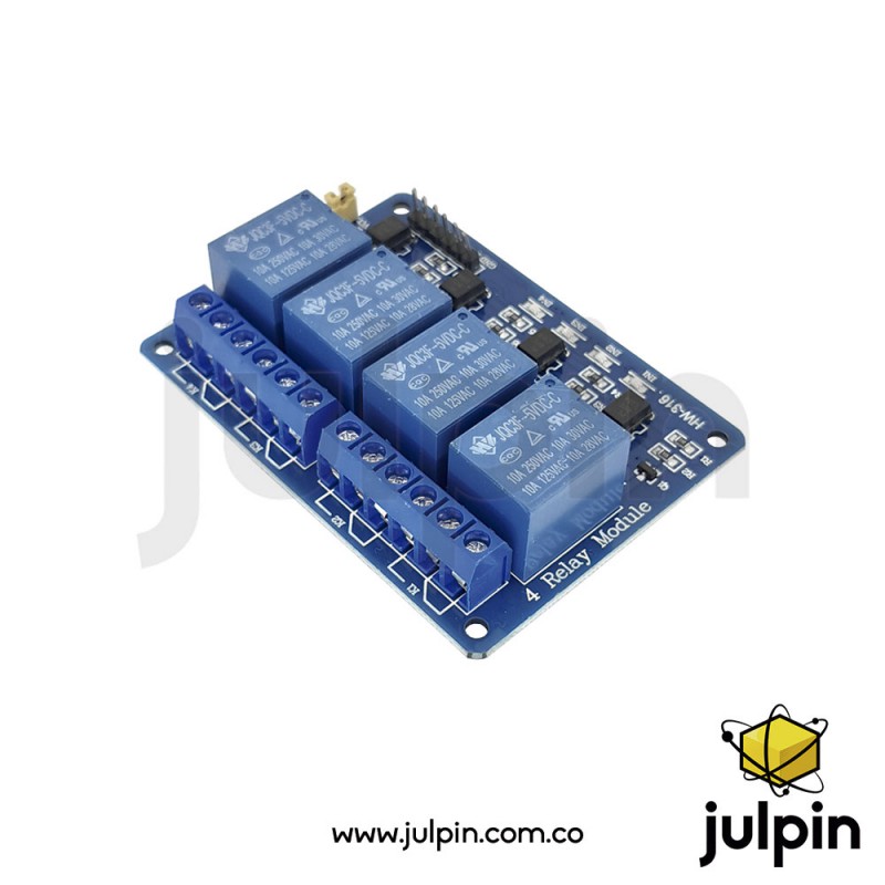 Se trata de un módulo de relé de 4 canales que opera con un voltaje de 5VDC, activación de nivel alto y que permite realizar trabajo con voltajes de hasta 250VAC a 10A, 125VAC a 15A y 30VDC a 10A con total seguridad, debido a que está diseñado con amplias ranuras de aislamiento entre la etapa de control y la de carga. Este módulo puede ser controlado directamente por una amplia gama de microcontroladores como Arduino, AVR, PIC, PLC, etc. El módulo posee una luz indicadora de su estado.