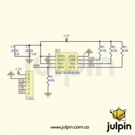 El módulo sensor de presión atmosférica o altímetro de precisión BME280 (GY-BME280-3.3) está basado en el sensor digital BME280 de Bosch Sensortec, reconocido por su alta precisión y estabilidad en la medición de presión barométrica, temperatura y humedad relativa.