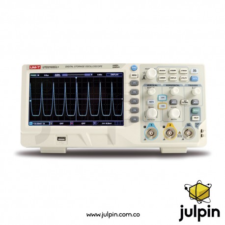 Este osciloscopio de la serie UTD2102CL+ de UNI-T es el nuevo modelo de osciloscopio de banco de un precio económico que cumple con las necesidades de mediciones y rangos esenciales para un taller o laboratorio. El diseño sencillo del panel frontal proporciona una fácil operación para los usuarios. Este modelo en particular es de 2 canales y un ancho de banda de 100MHz.