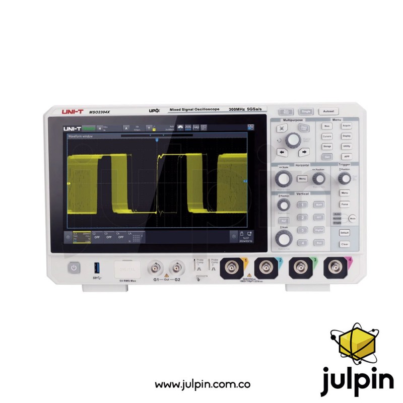 El oscilloscope de señal mixta UNI-T MSO2304X es un instrumento de medición profesional y versátil de la serie MSO2000X, diseñado para capturar y analizar con precisión señales analógicas y digitales simultáneamente. Con un ancho de banda analógico de 300 MHz, tasa de muestreo de hasta 5 GSa/s por canal y 100 Mpts de memoria profunda, este osciloscopio es ideal para depurar circuitos, diagnosticar fallas y verificar sistemas de alta velocidad.