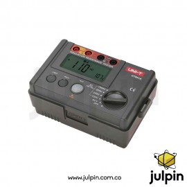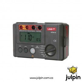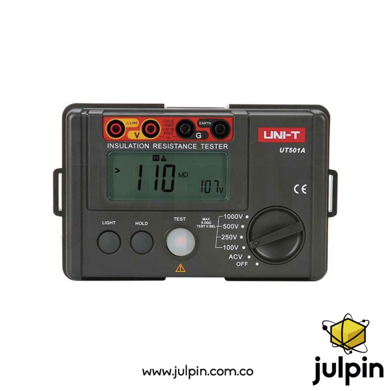 El medidor de aislamiento UNI-T UT501A es un megóhmetro digital portátil diseñado para medir la resistencia de aislamiento de cables, motores, generadores, tableros eléctricos y otros equipos eléctricos. Permite aplicar voltajes de prueba de 100 V, 250 V, 500 V y 1000 V, brindando una lectura fiable de la resistencia interna del aislamiento en megaohmios (MΩ) o gigaohmios (GΩ), lo cual es esencial para garantizar seguridad eléctrica y prevenir fallas por fuga de corriente.