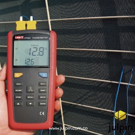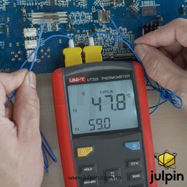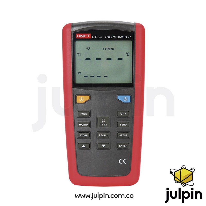 Gracias a su doble entrada (T1 y T2), el UT325 puede realizar mediciones simultáneas en dos puntos diferentes o comparar temperaturas lado a lado. Su pantalla LCD retroiluminada muestra fácilmente lecturas en °C, °F o Kelvin (K), e incorpora funciones útiles como retención de datos, modos MAX/MIN/AVG, alarmas programables alta/baja, almacenamiento de hasta 100 registros, y transferencia de datos vía USB para análisis en PC.