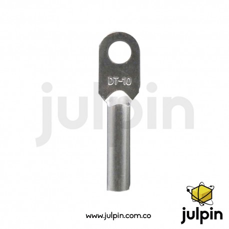 Este producto se trata de un terminal de ojo modelo DT-10. Este terminal posee un agujero de 8,2mm para introducir un tornillo o borne y un espacio de 6mm de diámetro para el cable a soldar en el terminal. Está fabricado en cobre, con un baño de estaño. Es ampliamente utilizado en la conexión de cables de polo a tierra y de corriente en sistemas eléctricos AC y DC. El cable se instala con soldadura, no es de ponchar.